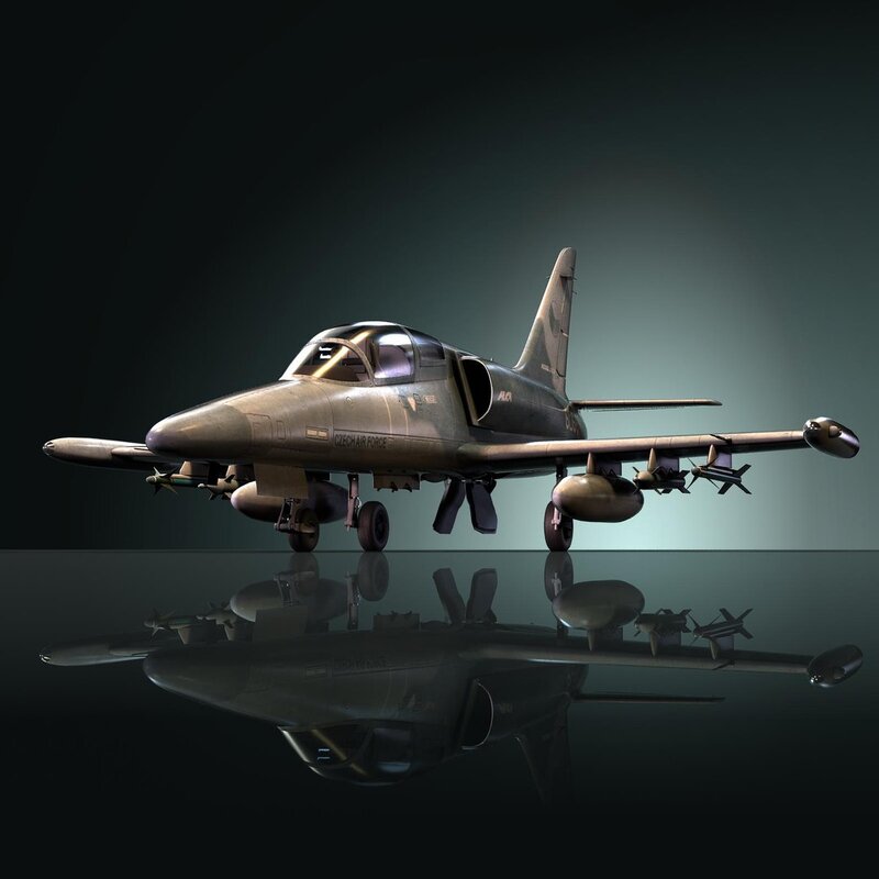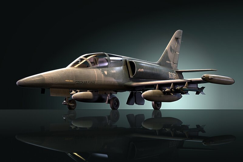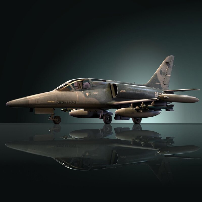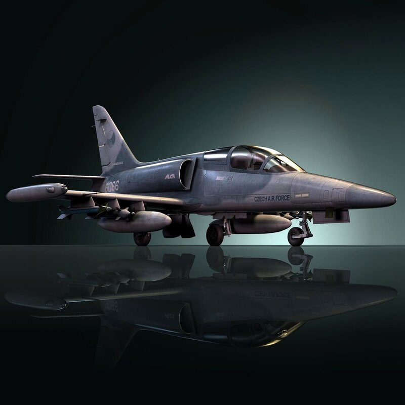 3D model of czech fighter airplane L-159 Alca with 4K textures in jpg. Contains 77 single polymeshes. Movable parts have pivots correctly placed.