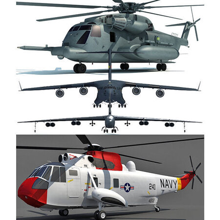 1 / Sikorsky SH-3 Sea King Polygons: 139,729 Vertices: 143,946 Textured as United States Navy. ...................................................................................... 2 / Sikorsky CH-53E Super Stallion Polygons: 231,223 Vertices: 233,475 There are two versions of the back door ( closed and open ). You can hide any one. ...................................................................................... 3 / C-17 Globemaster III Polygons: 121,950 Vertices: 128,136 3ds Max file included 2 versions: Vray and standard materials. ...................................................................................... 4 / B52 Bomber Polygons: 129,312 Vertices: 109,738 The 3d studio Max version is setup with Vray.