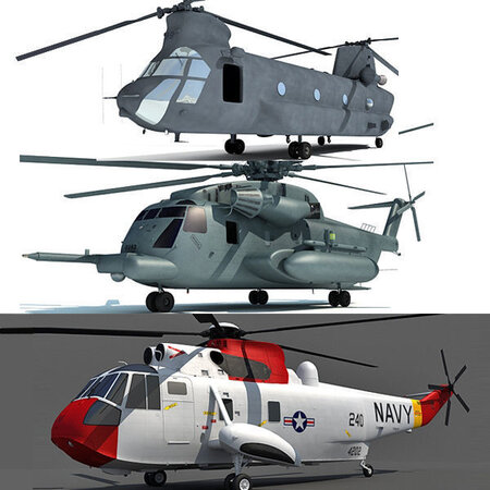 1 / Sikorsky SH-3 Sea King Polygons: 139,729 Vertices: 143,946 Textured as United States Navy. ...................................................................................... 2 / Sikorsky CH-53E Super Stallion Polygons: 231,223 Vertices: 233,475 There are two versions of the back door ( closed and open ). You can hide any one. ...................................................................................... 3 / Chinook Helicopter Polygons: 297,269 Vertices: 188,770 HDRI map not included.
