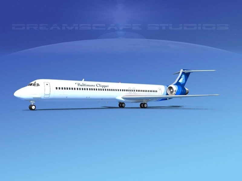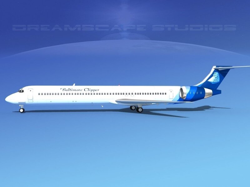McDonnell Douglas MD83 Baltimore Clipper This model was originally built in Max 13 near to scale (within 3-4% of scale) and fully textured. It comes with all the materials and textures shown in renderings here. It has a detailed exterior including radio antennas and pitot tubes. Landing gear have been finished with a moderate amount of detail too.