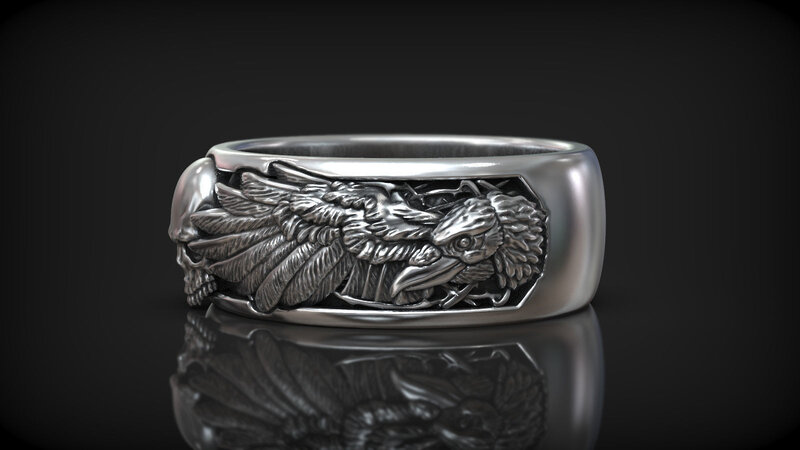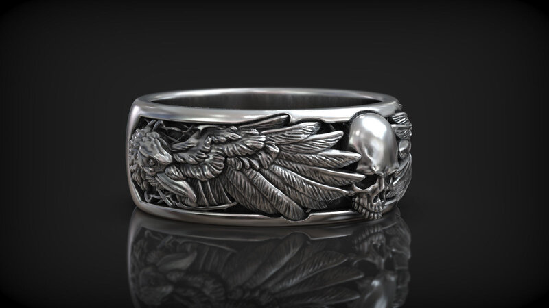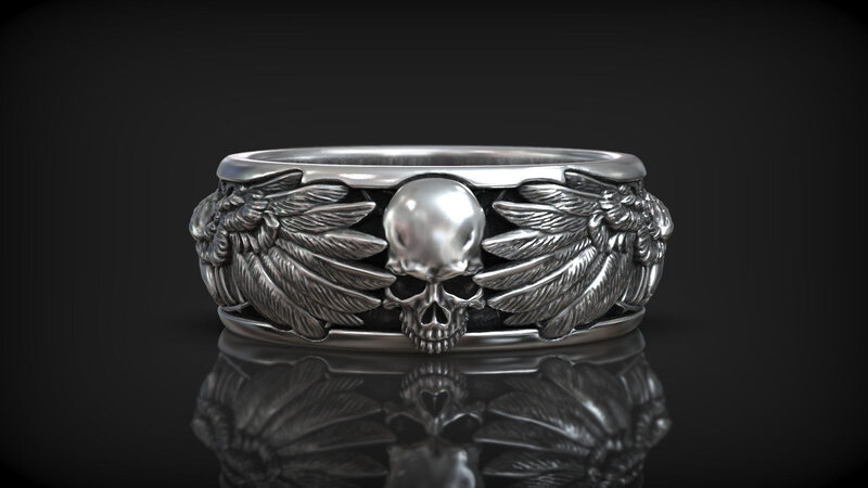 Introducing a captivating 3D ring model that encapsulates the mystique of darkness and wisdom. At its core is a detailed skull, exuding an air of enigmatic allure. Flanking the skull on either side are intricately crafted ravens, their wings outstretched in a dance of symbolism. The central skull serves as a focal point, a timeless emblem of mortality and introspection. On each side, the ravens, with feathers meticulously rendered, represent mystery, intelligence, and an ancient connection to the ethereal. Their presence adds an element of dynamic balance to the design. Crafted with precision through advanced 3D modeling techniques, this ring seamlessly blends dark aesthetics with meticulous artistry.