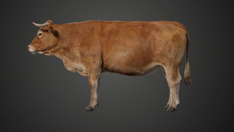 This is a cattle model with multiple 4K UDIM maps, fur, and rigging. The model is made with Blender and Cycles renderer at real-world scale.