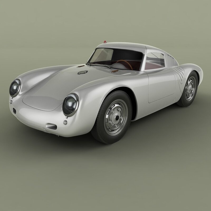 High detailed, correctly scaled model of 1956 Porsche 550 A Coupe. Originally created with 3ds Max 8. Rendered with V-Ray , files with standard materials are included. Unit system is set to metric units. Model is built to real world scale. Geometry is Editable Poly (quads/tris only). TurboSmooth is use separately to objects (74 of 101 named objects) with iterations 2 ( 786128 polys, 409647 vert.). Each file was checked before upload. Materials and textures are included (6 textures - jpg 1024X1024).