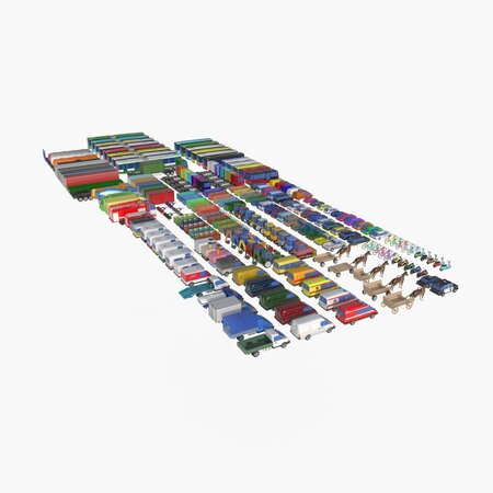 The pack itself contains: 68 unique objects, 200 different modifications and colors of vehicles. A set of bicycles, mopeds, motorcycles, golf cars, sedans, vans, pickups, jeeps, microbuses, minibuses, light-duty cars, medium-duty trucks, 2-axle and 3-axle tractors with a set of trailers, containers, buses, long buses, tractors, trailers tractors, bulldozers and excavators, the set also includes special equipment - firefighters, ambulances, police, gas services, a school bus, mobile homes.