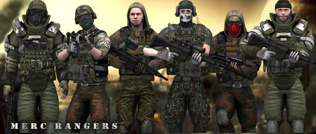 Merc rangers construction kit. Guns: AK47, M16, MP5K, MK11 sniper rifle, M9 pistol, knife. 10 heads x 10 textures 5 bodies x 10 textures 5 pants x 10 textures 5 shoes x 1 texture 5 hands x 1 texture 1 ammunition set - 5 variations x 10 textures Model with all the parts is delivered in a single file which are easily switched/managed within a 3D engine. Average triangles count for a fully equipped soldier ~ 5500