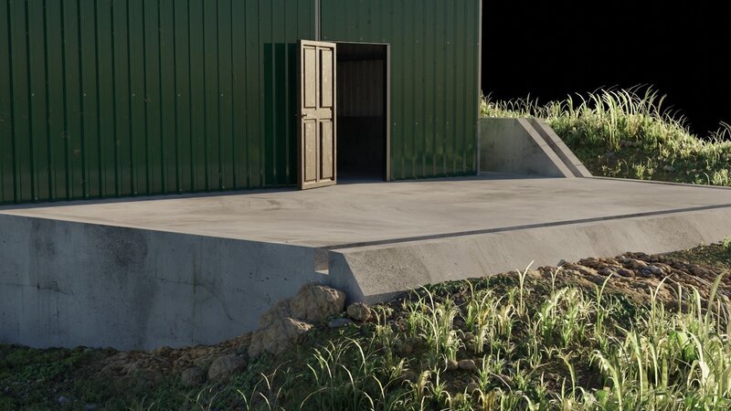 Metal profile shed or workshop for farms, scenery or other. One big metal door and one small wooden door to be opened or closed.