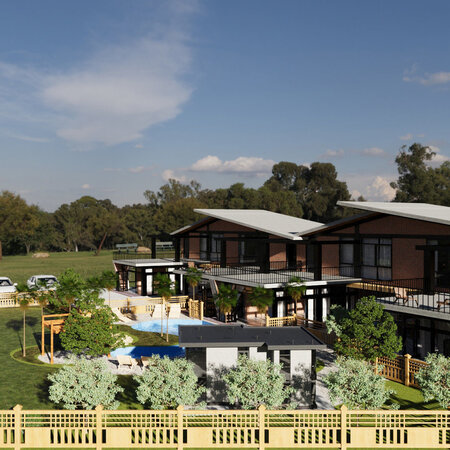 Modern Twin Villa with Swimming Pool and Patio (Exterior 3D Scene) Elevate your architectural visualizations with this captivating 3D scene featuring a contemporary twin villa development with a sparkling pool and inviting patio.