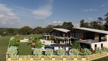 *Two modern villas: The villas feature clean lines, expansive windows, and a minimalist aesthetic, perfect for creating a sleek and stylish look. *Swimming pool and patio: A sparkling swimming pool and a furnished patio create a relaxing outdoor space, perfect for entertaining or unwinding. *Sunset lighting: The scene is bathed in the warm glow of a sunset, adding a touch of ambiance and visual interest.
