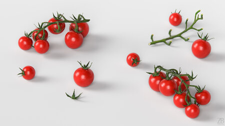 This is a 3d model of cherry tomatoes on a vine. It was scanned and prepared for photorealistic renderings, close-ups, stills and animation. The tomato model is ready to be inserted in your scene out of the box.