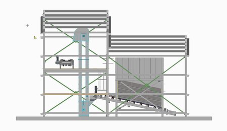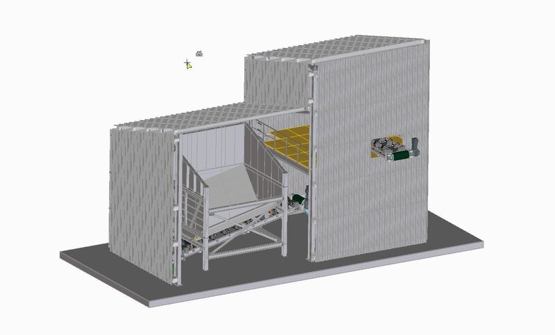 This is a doing unit made for a company who needed a perfectly calibrated batch of aggregates. The aggregates are stored in the hopper and then go trough a bucket conveyor to a conveyor on top. On the top conveyor there is a 3d laser measurementsystem integrated and the operator can ask a specific amount of aggregates trough a remote control.