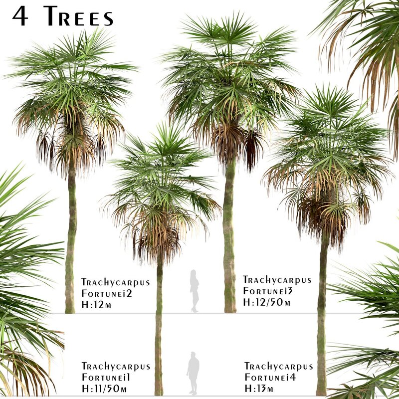 4 different Trachycarpus Fortunei trees in the scene.