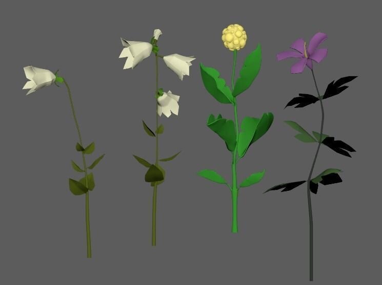 4 flowers to populate a scene. They are fictitious flowers, purple, white or yellow. You can change the colors, there are trumpets, balls and a standard. All ellements are grouped, quadrangulated, clean.