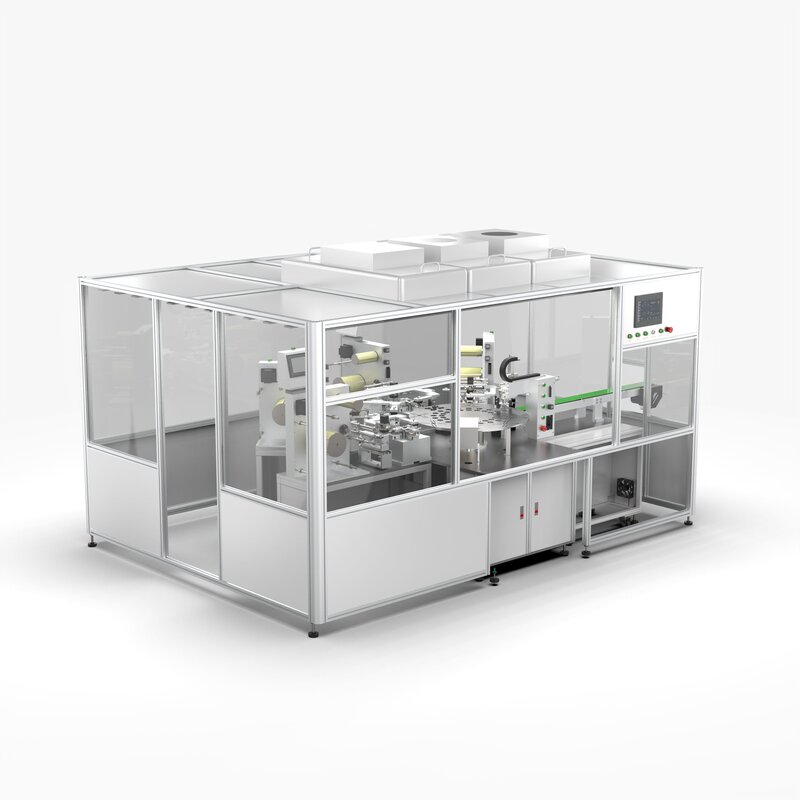 Manual feeding method with turntable divider, Feida label peeling system modular grasping and transplanting, secondary positioning system module automatic bonding, automatic matching of different combinations of production needs according to SN information code, stable and air-free labeling No wrinkles, the equipment has produced an optimized and improved version.