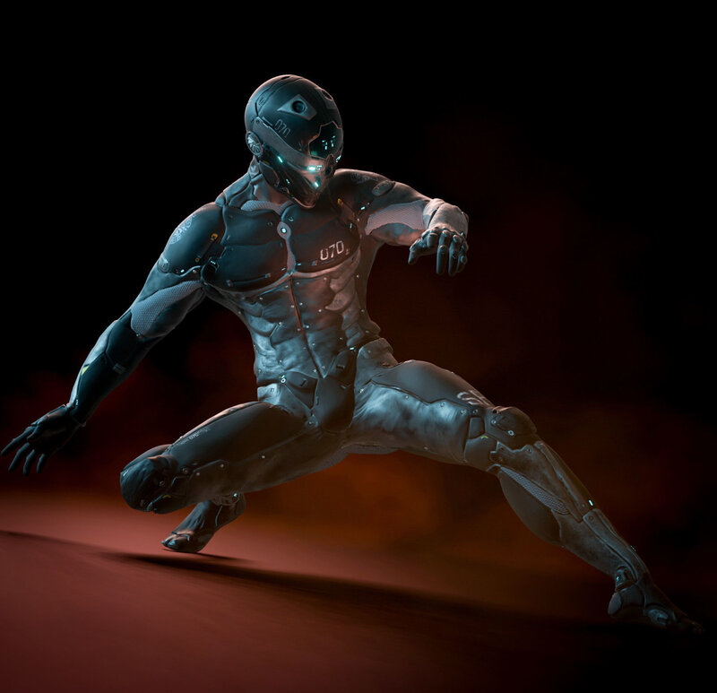 A fully textured and rigged 3D model of a sci-fi cyborg/robot character.